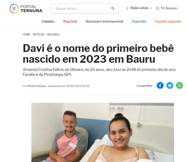 Portal Ternura: Davi é o nome do primeiro bebê nascido em 2023 em Bauru